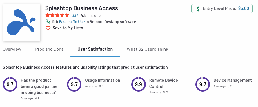 While Splashtop comes in at a rating of 4.8, its designation as the 11th easiest to use remote desktop software indicates in may not, in fact, be easy to use.